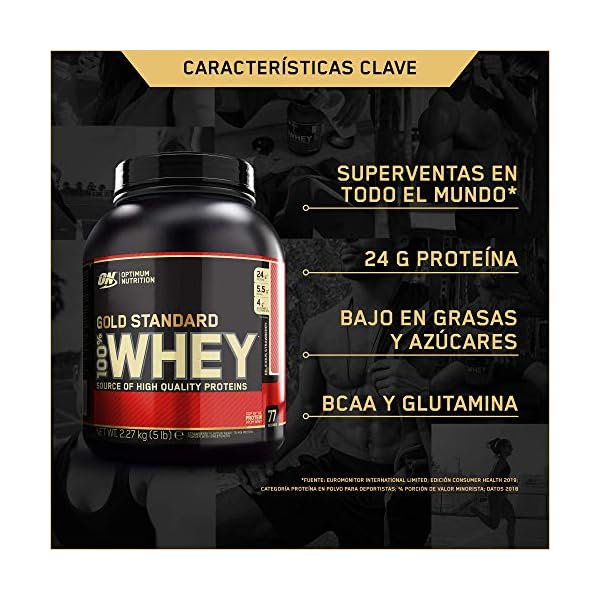 Gold Standard Whey de Optimum Nutrition lleva siendo la primera opción mundial en de proteína en polvo de suero de leche más de 20 años. Con una mejora constante de su fórmula, la versión actual de ON Gold Standard Whey es la más eficiente y ofrece la absorción más rápida hasta la fecha, gracias a que emplea la proteína de suero aislada como ingrediente clave, de modo que ayuda a conservar el músculo y a su recuperación. Es bajo en azúcar y grasa, lo que hace de este producto una opción saludable que aporta energía inmediata. La fórmula instantánea de Gold Standard Whey lista para mezclar te permite disfrutar a cualquier hora del día, ya sea en una botella o como complemento de tus comidas y bebidas favoritas. Disponible en envases de 450 g, 900 g, 2,27 kg, 3,16 kg y 4,54 kg.