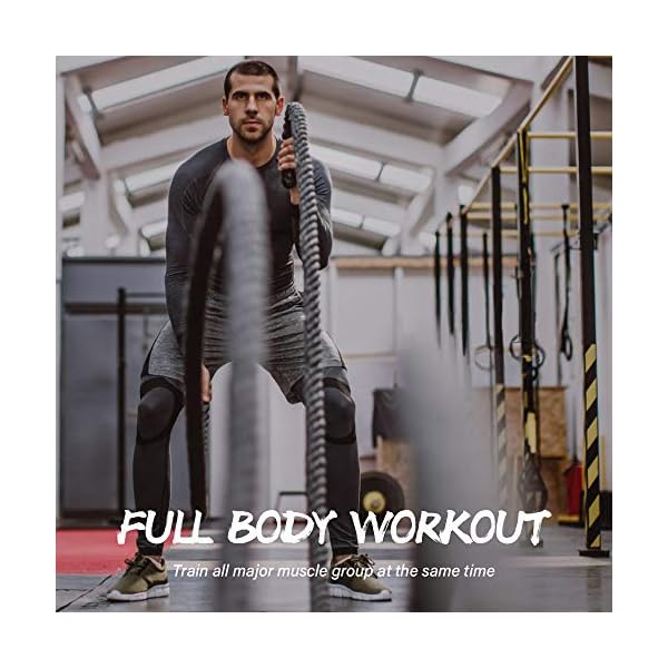 ✅ Ofrecer Ejercicios para Todo el Cuerpo – Cuerda de batalla puede producir una fuerza de resistencia efectiva para entrenar la fuerza nuclear de las manos, los brazos, los hombros, la espalda e incluso las piernas para un ejercicio de todo el cuerpo. El uso de cuerda puede construir músculo, aumentar la resistencia y quemar calorías.