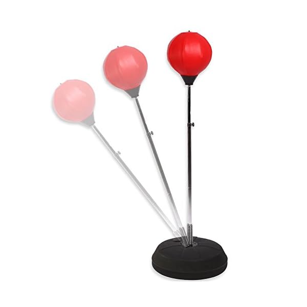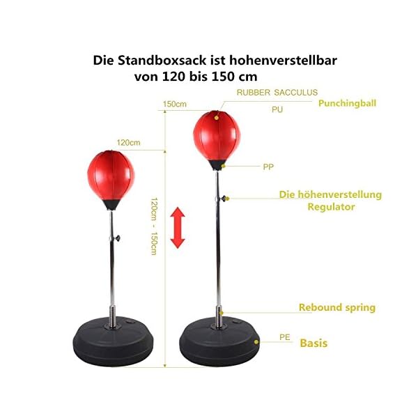 Diseño clásico, ahorro de espacio, fácil de montar y desmontar. Saco de boxeo de pie con alta estabilidad, varilla de metal de resorte de 120 a 150 cm, puede ser inclinado hasta 90º. La base puede estar opcionalmente llena de agua o arena, muy simple y fácil de usar.